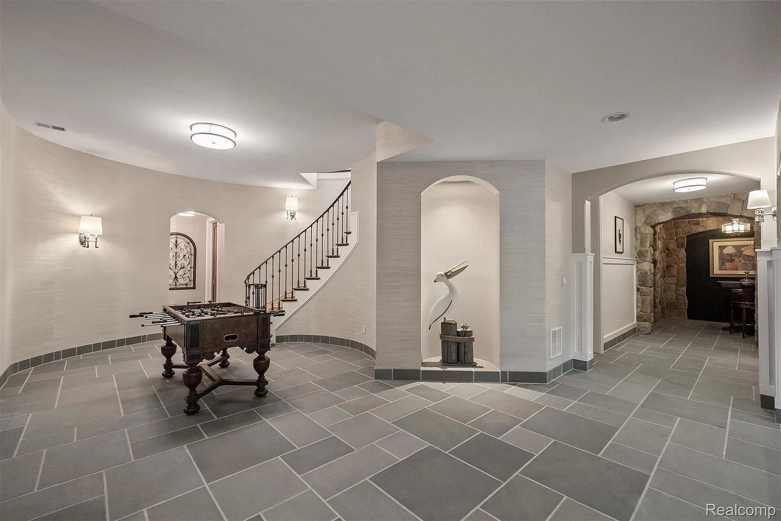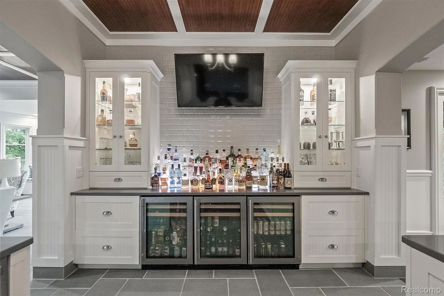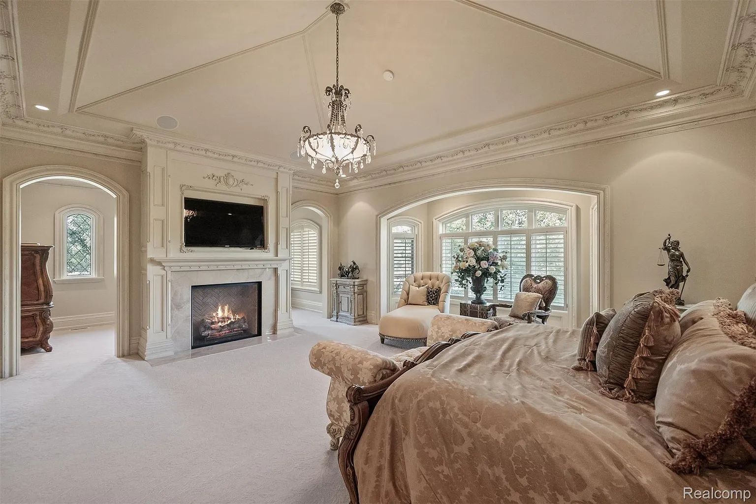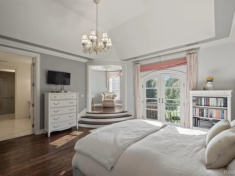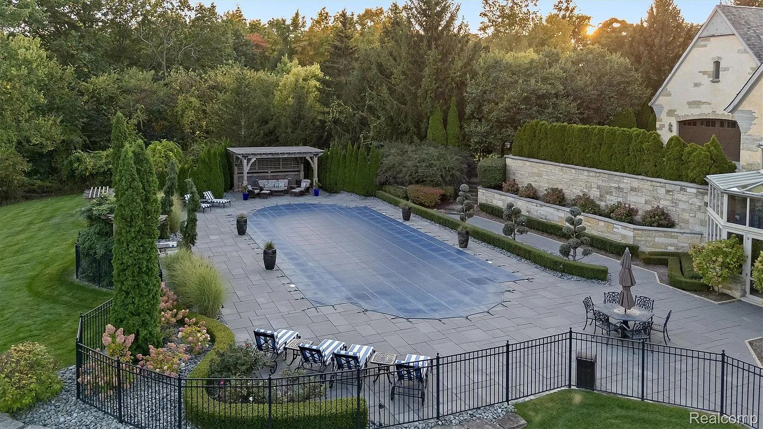 The copper catches the morning light. Hammered by hand, set into stone countertops that Bella Cucina selected for this kitchen and no other, the sinks glow with a warmth that stainless steel will never replicate. Two islands anchor the room—one for prep, one for gathering—with top-tier appliances built into the workflow and a walk-in pantry behind the door deep enough to disappear into. The hand-scraped, pillow-edged pecan floors run beneath your feet, warm and textured, and through the beamed family room beyond the kitchen, twin French doors open to a covered terrace where the 60-foot pool catches the same morning light the copper just caught. You're standing in the social center of 5537 Orchard Ridge Drive, and Bella Cucina's kitchen has done exactly what the best kitchens do: made you want to stay. The house earns the kitchen. Dominick Tringali designed the Normandy French Tudor in collaboration with Schaerer interior design, and the result is approximately 15,000 square feet of custom millwork, intricate ironwork, and bespoke finishes across every level. The barrel-ceiling foyer with its sweeping iron staircase. The two-story library, spiral staircase, limestone fireplace, coffered ceiling, a wall of glass overlooking the grounds. The first-floor primary suite in its own wing: heated floors, onyx countertops, his and hers walk-in closets, and an ensuite bath that functions as a private retreat. Every upstairs bedroom is a custom suite. A private in-law or au pair apartment includes a full kitchen. The elevator connects all floors. Six bedrooms, six full and three half baths, and a floor plan that never sacrifices intimacy for scale. The walkout lower level delivers the resort. The horseshoe bar with its bespoke ceiling detail. The golf simulator. The billiards area, the fitness room, the indoor spa, the wine room with tasting area. And the greenhouse, a glass-walled atrium with a sauna that opens to the pool deck, the 60-foot swimming pool beyond it, and the nearly four gated acres of Orchard Ridge stretching out to the tree line. Fire pit. Multiple entertaining decks. Common areas bordering the property. Generator, Sonos, central vacuum, heated garages, alarm system. You eat dinner at the island as the sun drops, the copper sinks glowing amber, the pecan floors warm, the covered terrace visible through the French doors, and the Tringali estate doing what the best residential architecture in Michigan has always done,making a house feel like a world, and making that world feel like it was built specifically, exclusively, and unmistakably for you.