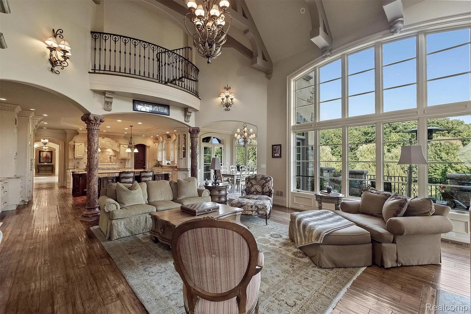 Barrel-Ceiling Foyer & Two-Story Library – A soaring barrel-vaulted foyer with sweeping iron staircase opens to a two-story library with spiral staircase, limestone fireplace, coffered ceiling, and full-height windows overlooking the estate's nearly four gated acres.