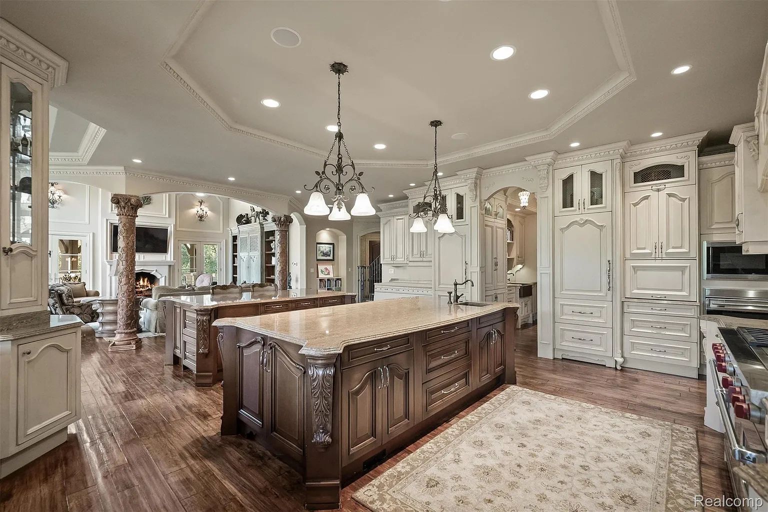 Bella Cucina Kitchen — Hammered Copper, Dual Islands & Stone – A custom Bella Cucina kitchen with hammered copper sinks, dual islands, stone countertops, top-tier appliances, and a walk-in pantry anchors the main level—one of the most significant residential kitchens in Southeast Michigan.